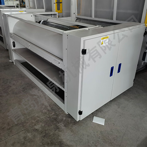 把纖維、原料經(jīng)喂入平簾輸送至喂入羅拉,再由開(kāi)松輥高速開(kāi)松后,經(jīng)輸棉風(fēng)機(jī)以適量的風(fēng)量輸送纖維原料供后遞工作使用。經(jīng)本機(jī)開(kāi)松后的纖維、原料效果好,均勻、細(xì)致。